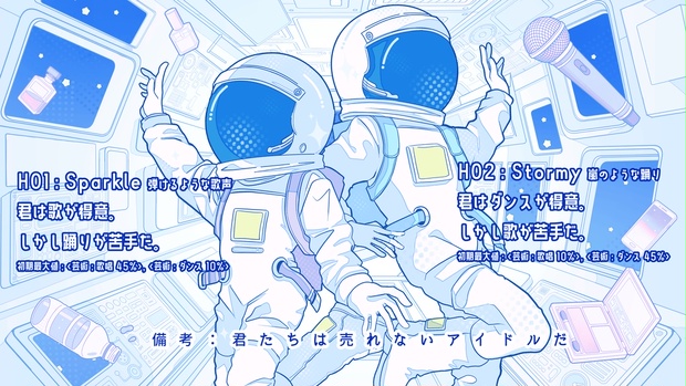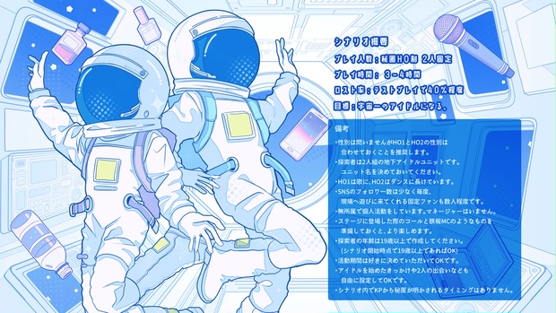 この作品は合同シナリオ企画『花道だけを歩けたら』に参加したシナリオです。 詳細はこちら⇒https://lit.link/HaNa_idol_TRPG Xアカウント⇒https://x.com/hana_idol_trpg ■シナリオ概要 タイトル:Starlight Stardom プレイ人数:秘匿HO制 2人固定 プレイ時間: 3~4時間 ロスト率:テストプレイで40%程度 目標:宇宙一のアイドルになる。 備考:君たちは売れないアイドルだ。 ■キャラクター作成に関して いずれかのHOから1つを選ぶ。 ◆HO1:Sparkle 弾けるような歌声 君は歌が得意。しかし踊りが苦手だ。